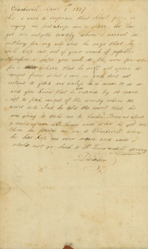 Sir i wish to inform that Mrs felps is trying his best to keep me a slave; he has got me out of the county where i connot do nothing for my self and he says that he will keep me out of your reach if possible. therefore i hope you will do the more for me. for i believe that he will not apear to court from what i can see and does not intend to fetch me unless he is made to do so. and you know that he was ordered by the court not to fetch me out of the county where the court sets. And he told the court that he was going to take me to Lualin Browns about 9 miles from St Louis and when he got me there he forced me on to Clarksvill where he has kep me ever sense and said i shold not go back to St Louis untill spring