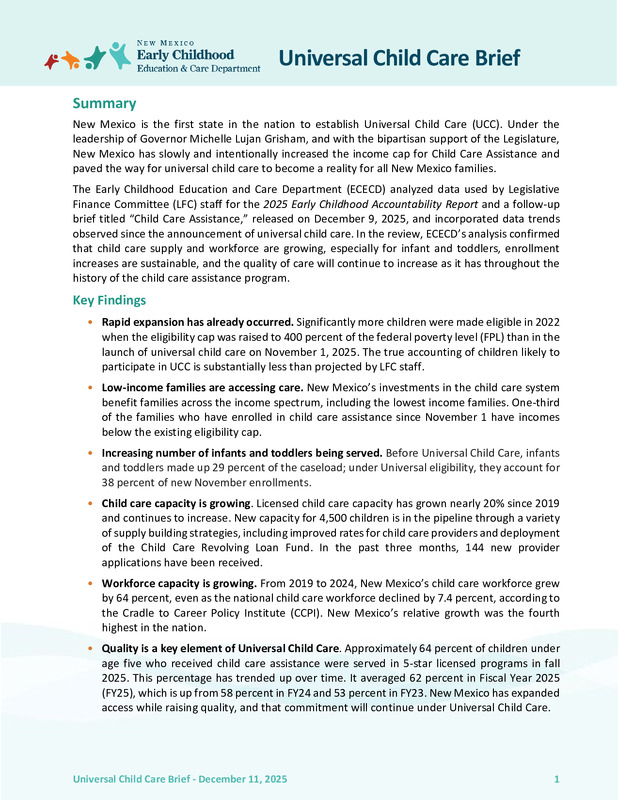 Today, our state is closer than ever to establishing the nation’s first universal child care system, but ‘close’ is not enough. New Mexico can act decisively to finish the job and model a world-class early childhood system. The opportunity is extraordinary. Families are waiting, providers are ready, and the solutions are within reach.